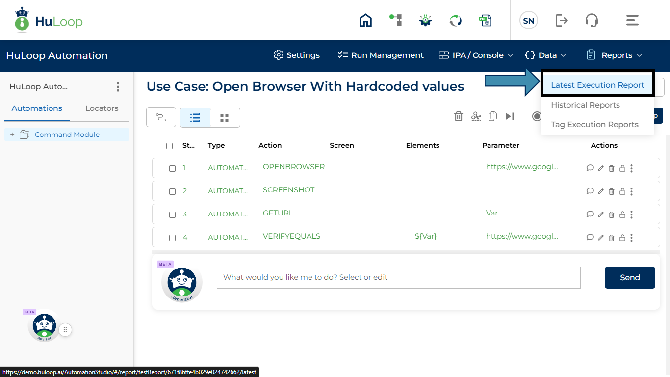 - Go back to the case page and expand the Reports option and select Latest Execution Report.