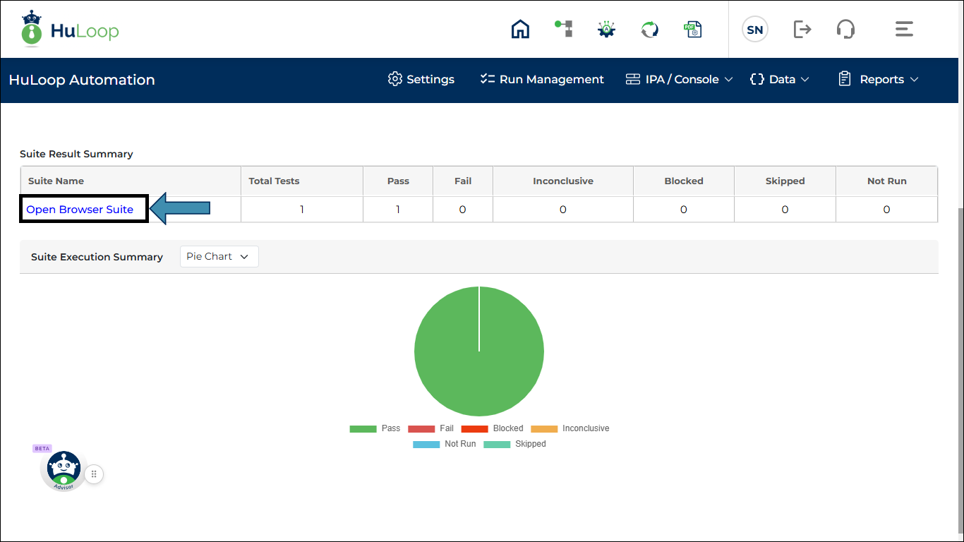 - Scroll down and click the Suite Name under the Suite Result Summary (e.g., Open Browser Suite).