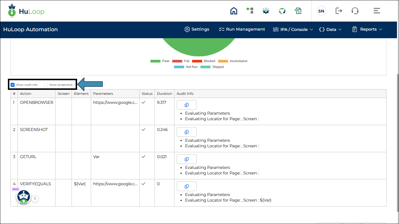- In the Test Run Details page, select Show Audit Info to view audit details or Show Screenshot to display screenshots.